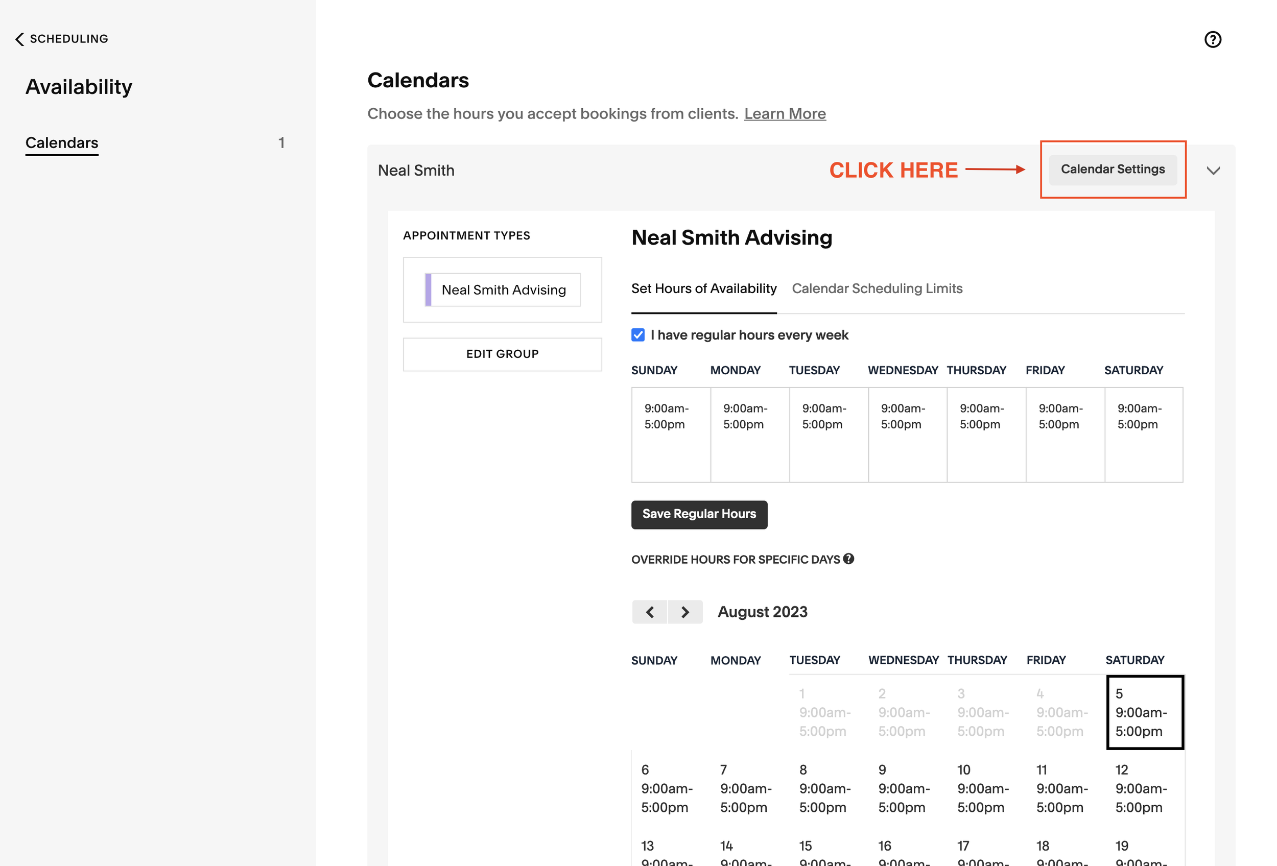 Navigate to the “Calendar Scheduling Limits” tab to set your preferences on when and how frequently you can be booked.