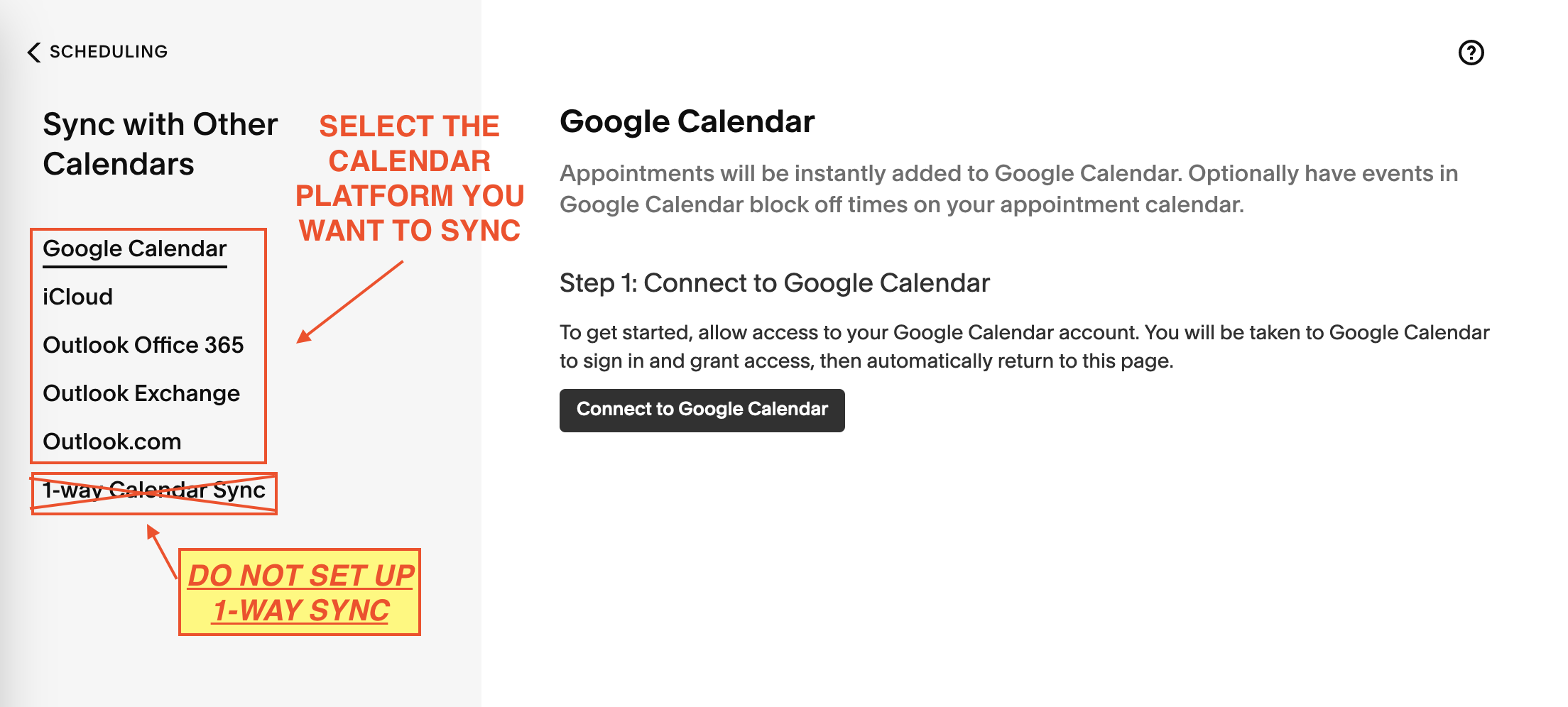 Once you’re on the Scheduling home page choose "Sync with Other Calendars."