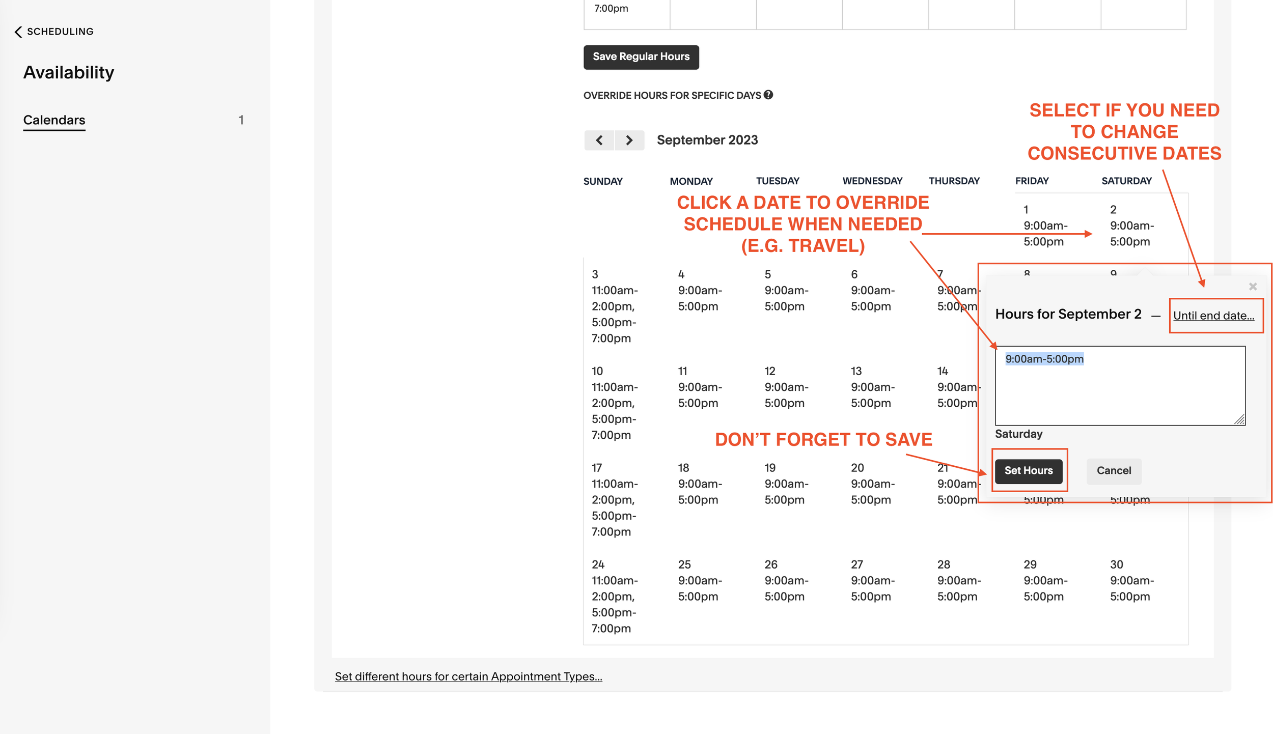 Your calendar will only show availability during those times, unless you have appointments booked during those times or if you override your schedule (see below).