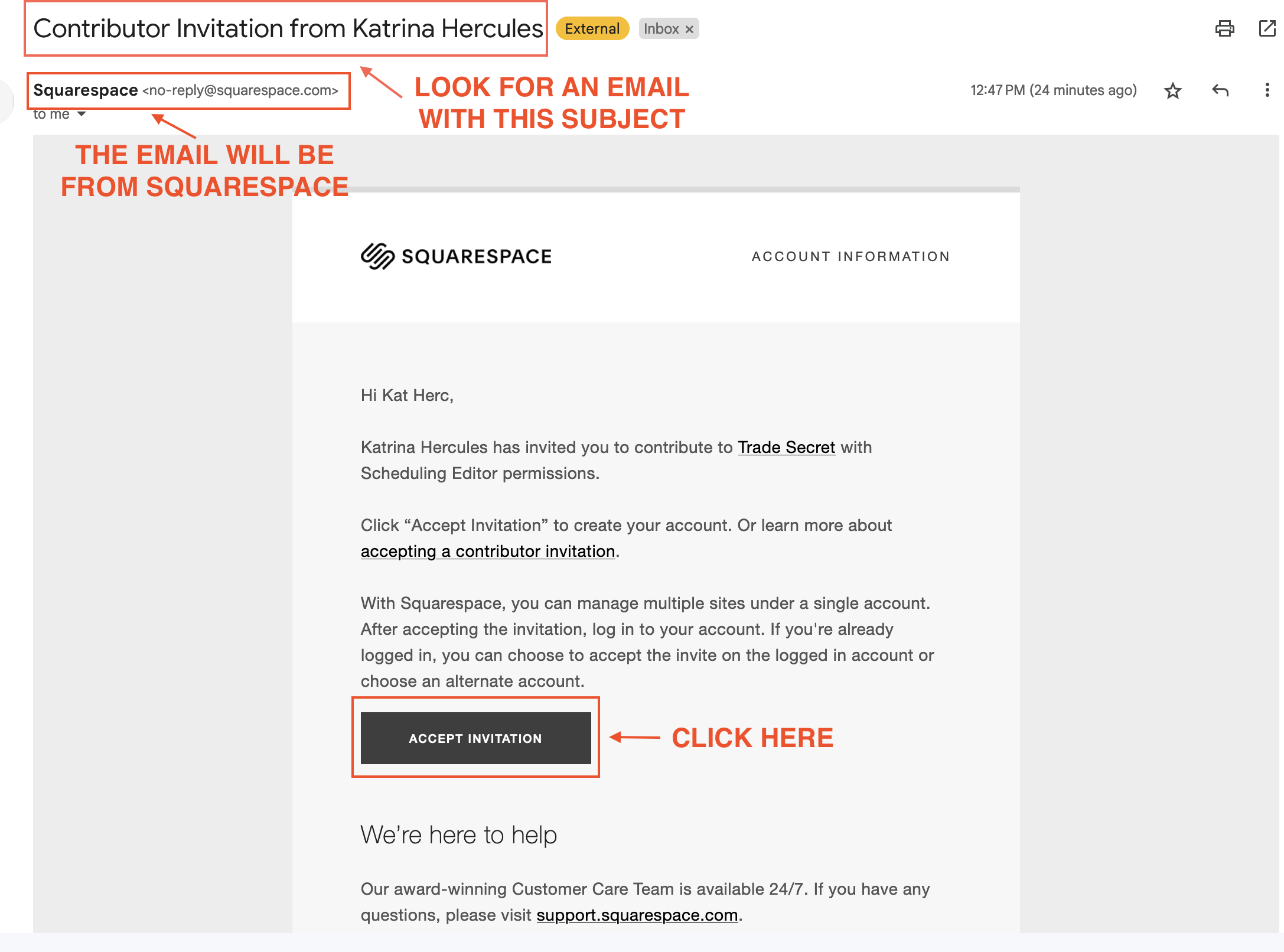 An email has been sent to your provided email address from Squarespace with an invite to become a contributor.