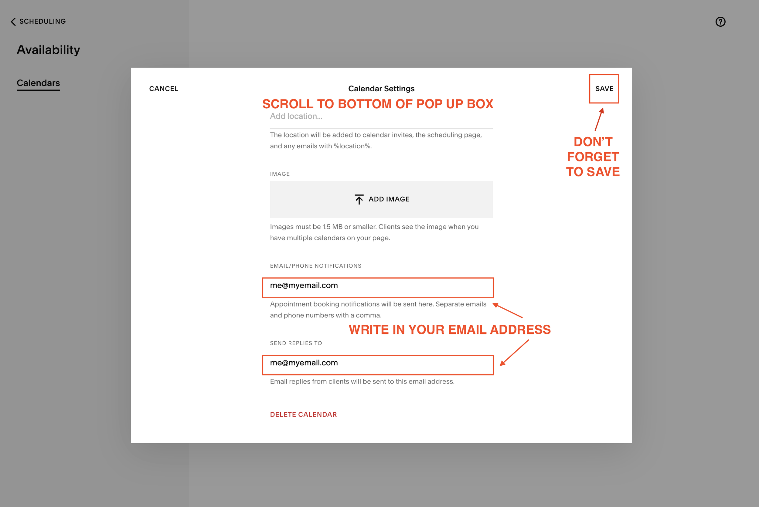 Navigate to the “Calendar Settings” popup box and add your email address to both boxes indicated so you receive all your communications.